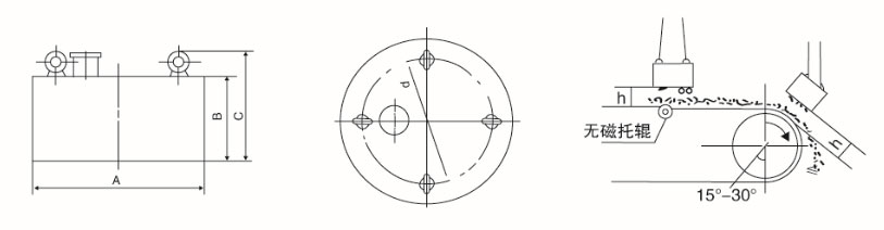 型號> | 冷卻方式 | 適應(yīng)帶寬 mm | 額定高度 mm | 磁場強(qiáng)度 mT | 勵磁功率 kw | 適應(yīng)帶速 ≤m/s | 外形尺寸mm φD×B | 重量 | |